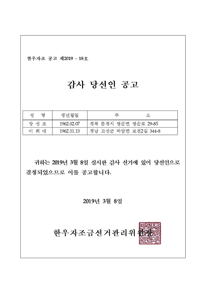 제4기 후반기 한우자조금 관리위원장 당선인 공고