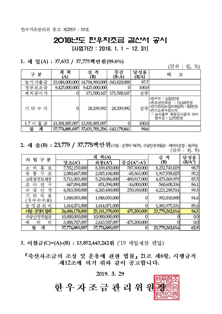 2018년도 한우자조금 결산서 공시