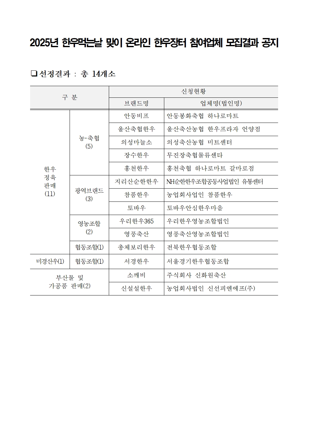 2025년 한우먹는날 맞이 온라인한우장터 참여업체 모집결과