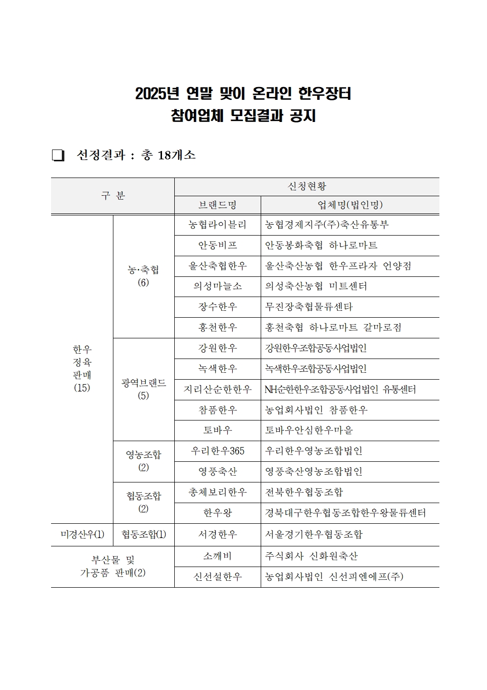 2025년 연말 맞이 온라인 한우장터 참여업체 모집결과 공지