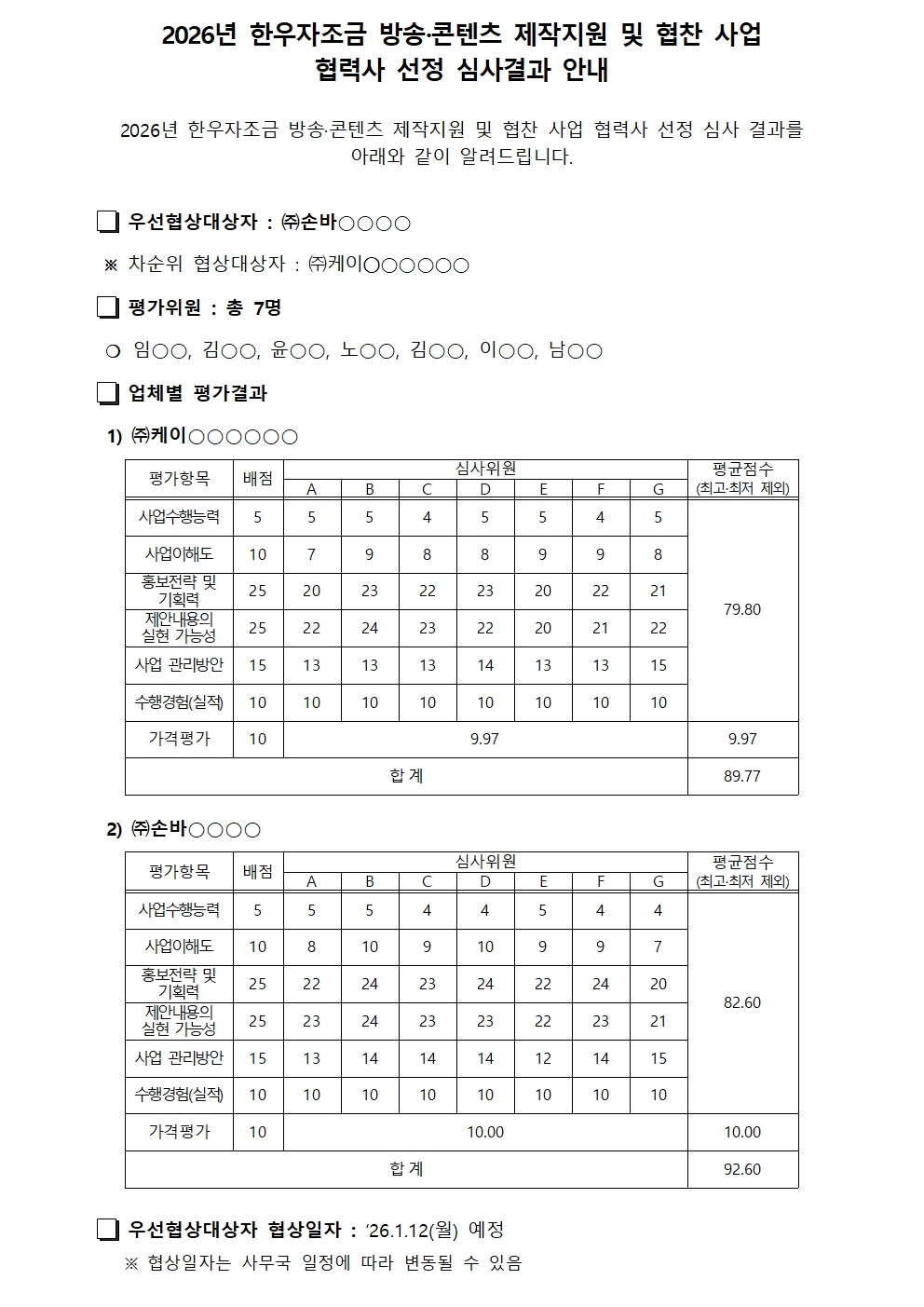 2026년 한우자조금 디지털광고, 홈페이지SNS운영관리 사업 협력사 선정 1차 서류 심사결과 및 2차 PT심사 대상 업체 안내