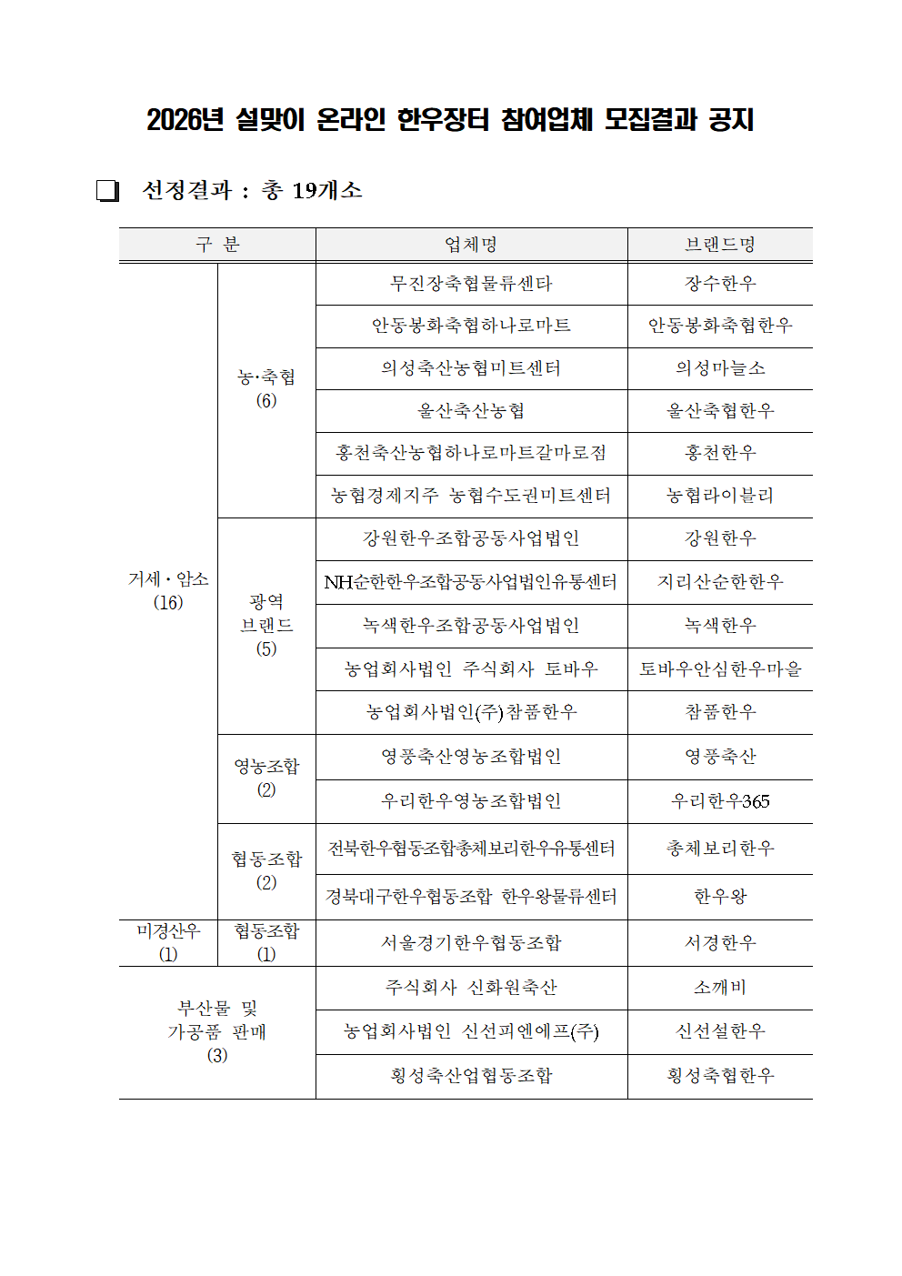 2026년 한우자조금 디지털광고, 홈페이지SNS운영관리 사업 협력사 선정 2차 PT심사 결과 및 우선협상대상자 안내