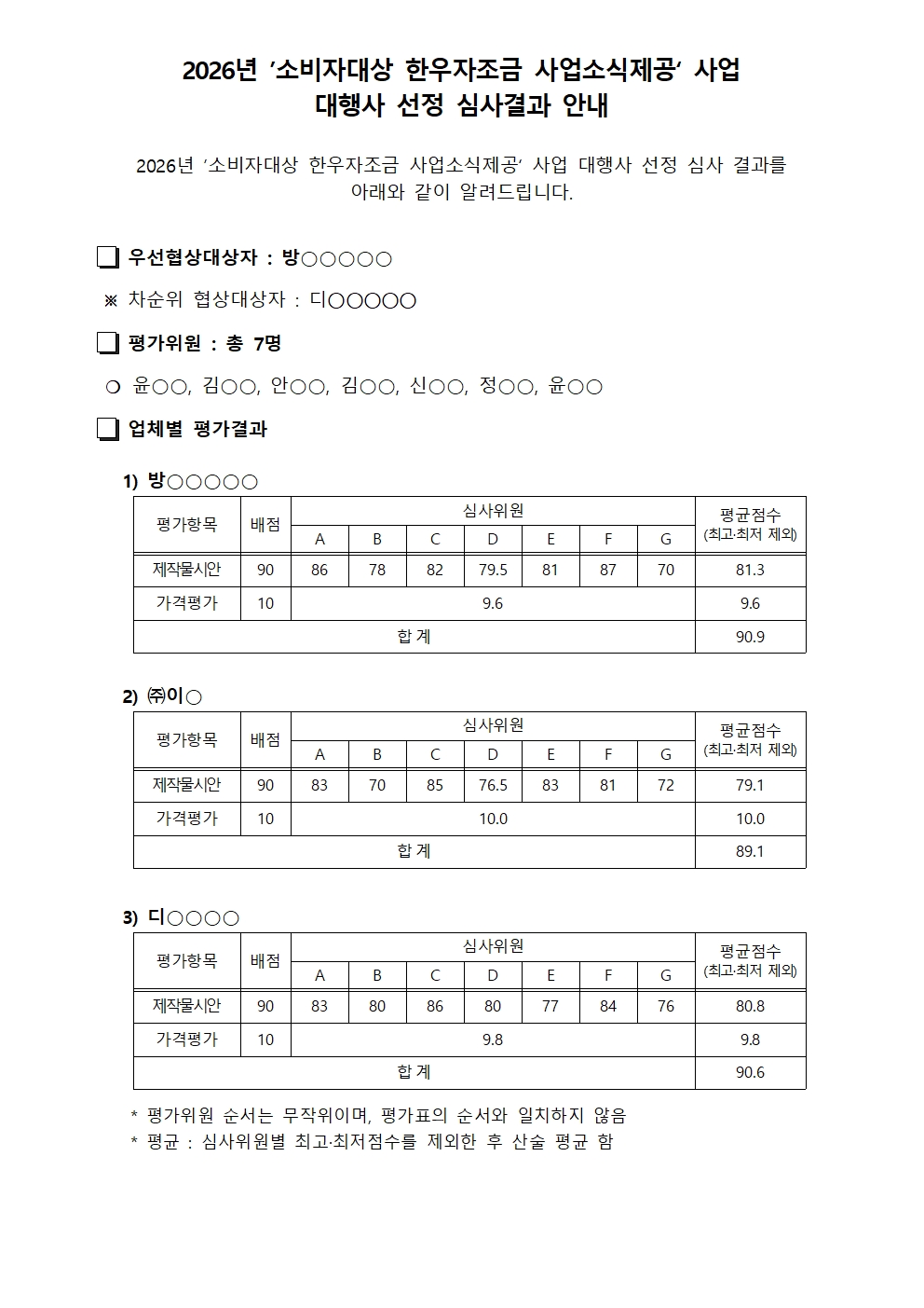 2026년 한우자조금 한우육포 제조 및 발송 용역 입찰 심사결과 안내