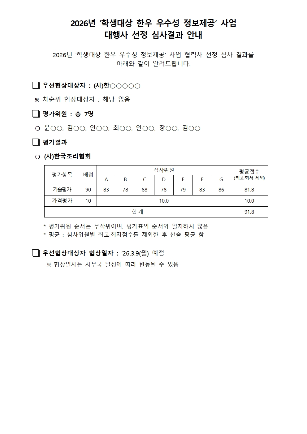 2026년 학생대상 한우 우수성 정보제공 협력사 선정 심사 결과 안내