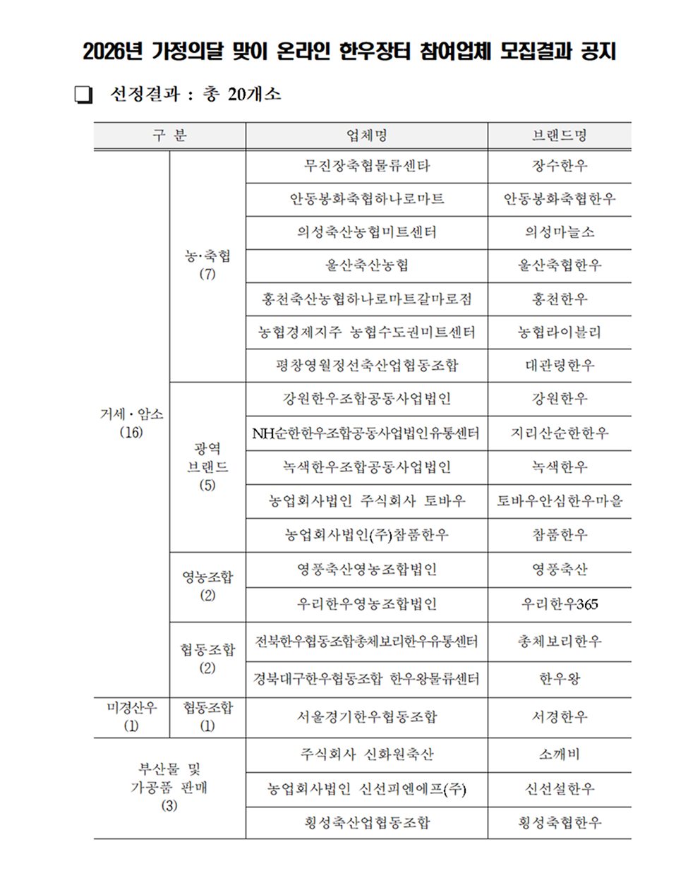 (공지) 2026년 가정의달 맞이 온라인 한우장터 참여업체 모집결과 공지.hwp