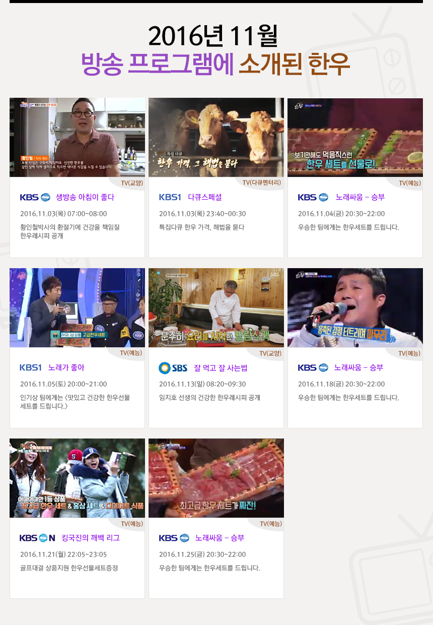 2016년 11월 방송 프로그램에 소개된 한우
