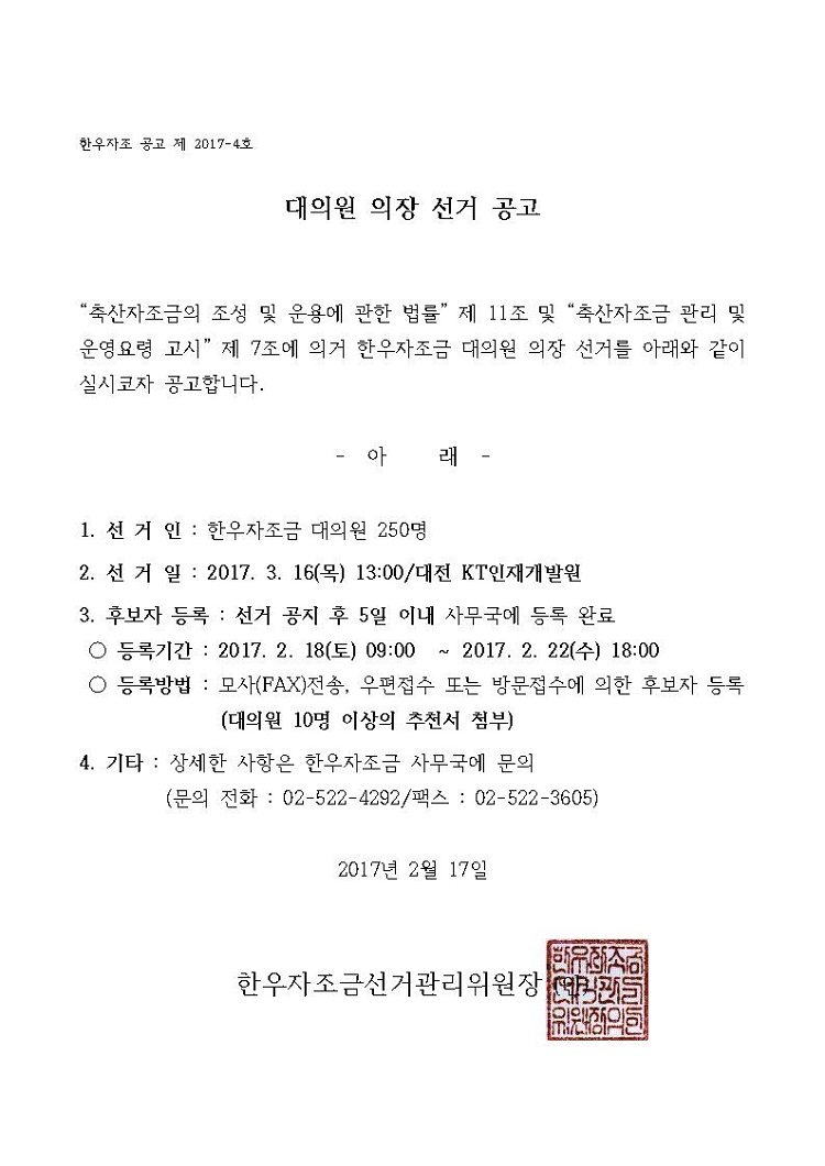[선거공고]한우자조금 의장, 관리위원, 관리위원장, 감사 선거일정 및 공지사항