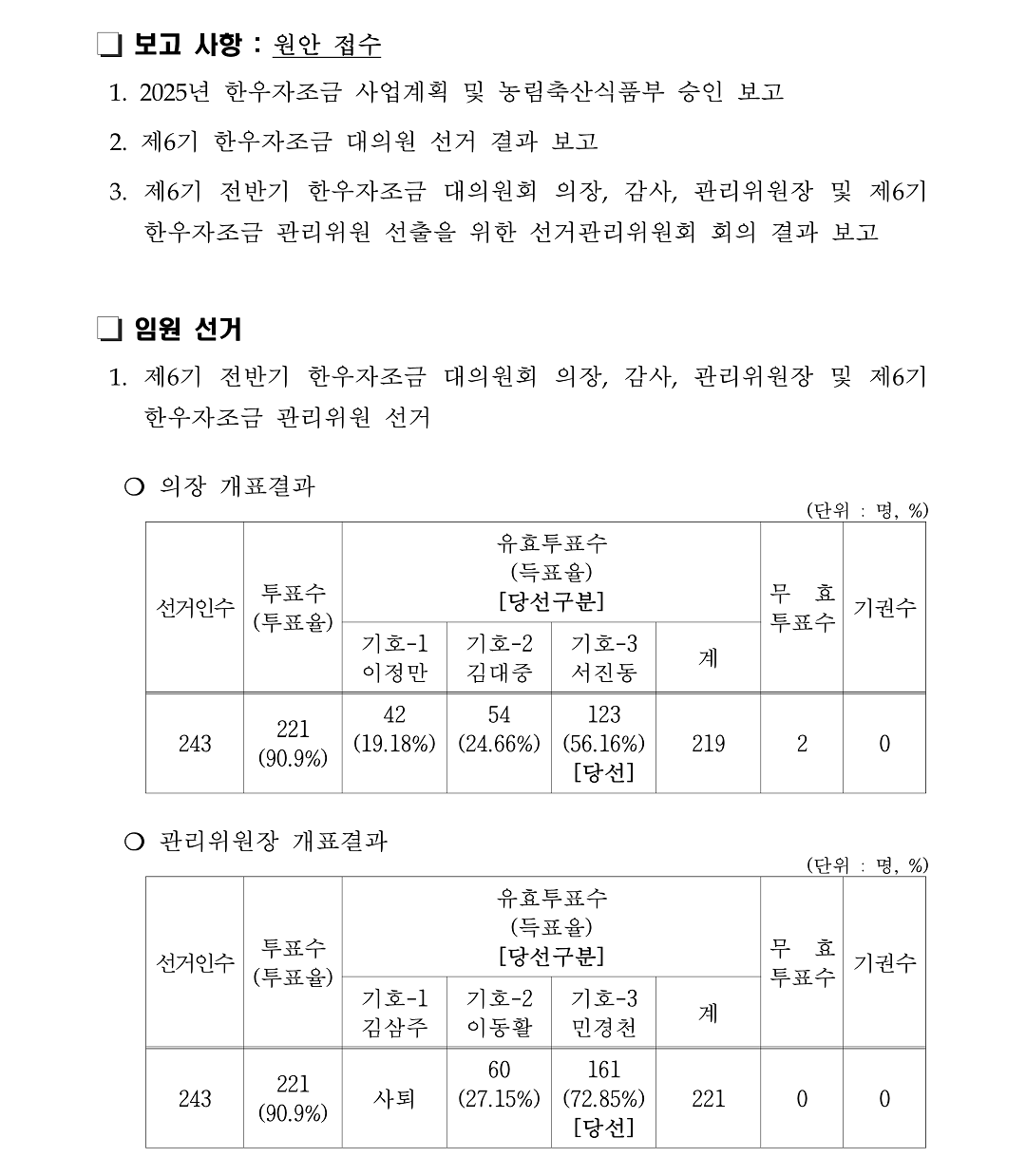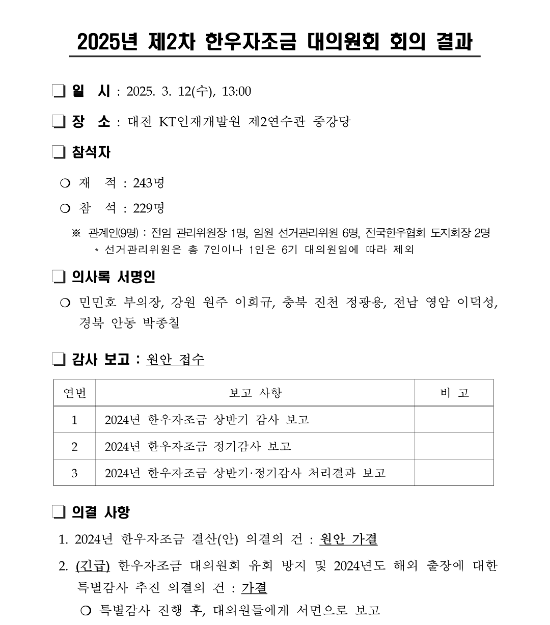 2025년 한우자조금 사업계획 및 예산 변경(안) 서면의결 결과