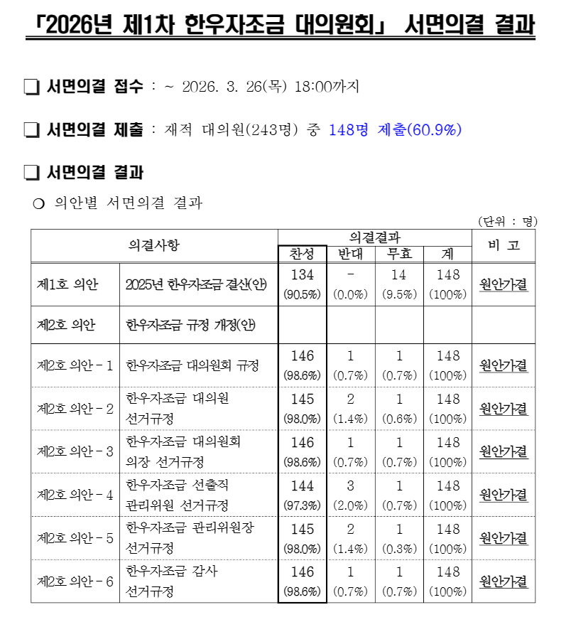 2026년 제1차 한우자조금 대의원회 서면의결 결과