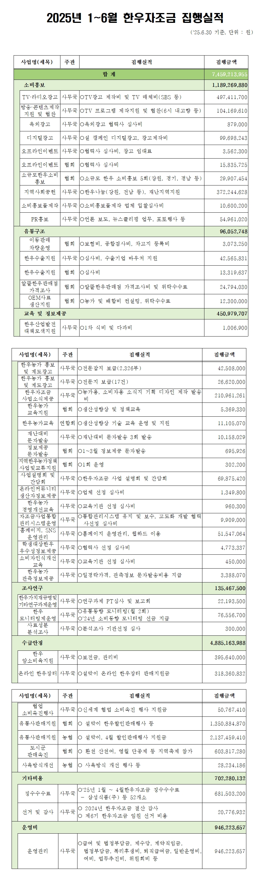 2025년 1월~6월 한우자조금 집행실적