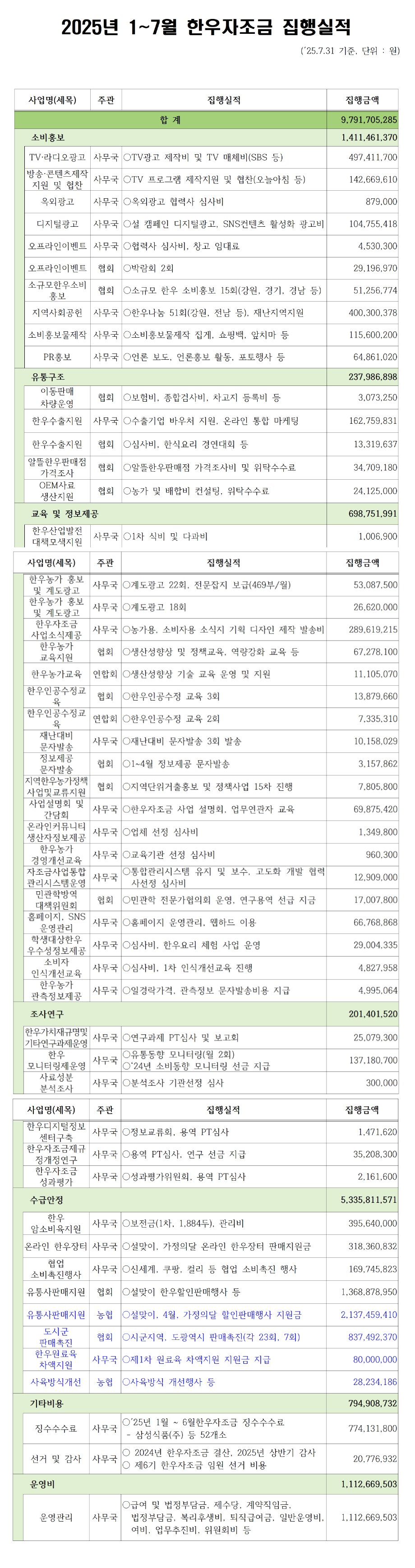 2025년 1월~7월 한우자조금 집행실적