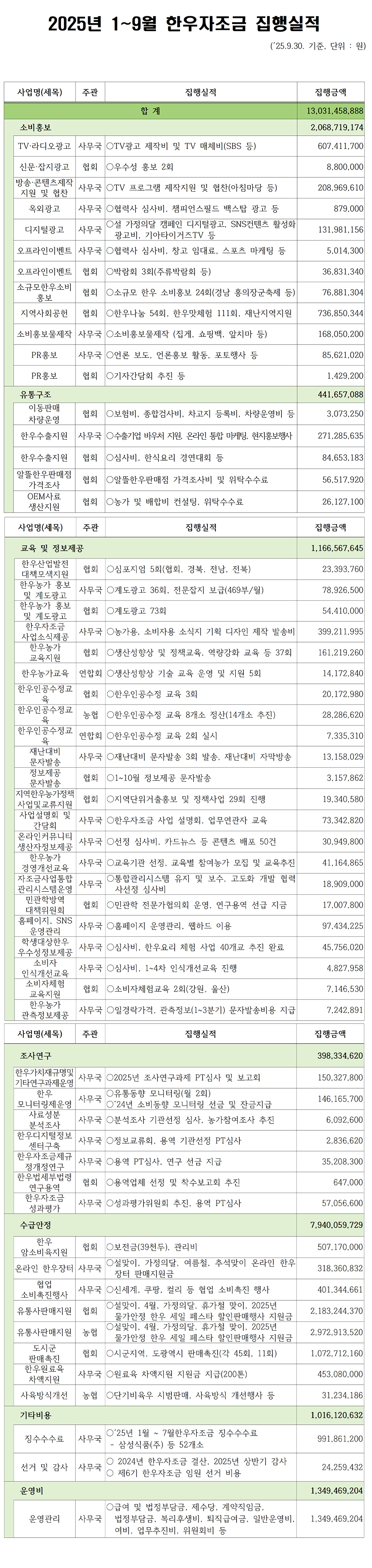 2025년 1월~9월 한우자조금 집행실적